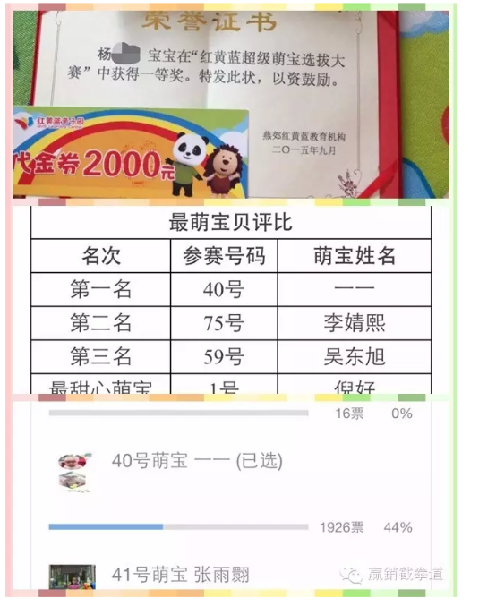 因为血浓于水,我的父母为外孙女做事一定会全力以赴。那么接下来我们要在投票截止日期之前拿到第一。所有人投票的票数是公开出来的,我们完全可以看到每个孩子的投票票数,这样自然有了全局观,不至于盲目投票以至于票数过少或者票数太多浪费资源。我的父母找到同事投票,找相关部门同事投票,找亲属投票,找朋友投票。亲属中有很多是老师,他们带过很多班级,他们可以找到同学家长投票。我的父母找到我的公公婆婆,同时公婆家的亲戚、朋友也不停的拉票。最终经过25天的努力,我们为宝宝拉到1926张投票,获得了本次萌宝的第一名!